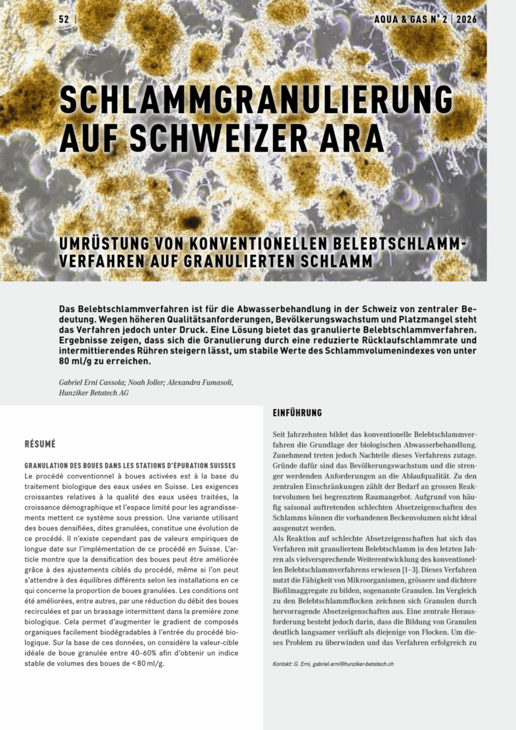 Das Belebtschlammverfahren ist für die Schweizer Abwasserbehandlung von grosser Bedeutung, steht jedoch aufgrund steigender Anforderungen an die Qualität und dem daraus folgenden Platzmangel unter Druck. Eine vielversprechende Lösung bietet das granulierte Belebtschlammverfahren. Auf der ARA Gossau-Grüningen wurde dazu im 2023 und 2024 ein erfolgreicher Pilotversuch durchgeführt. In der Fachzeitschrift Aqua und Gas wurde im Februar 2026 eine Zusammenfassung der aktuellen Erkenntnisse von acht Kläranlagen veröffentlich. Die Ergebnisse zeigen, dass das Verfahren in der Schweiz erfolgreich umgesetzt werden konnte. Die ARA Gossau-Grüningen wird für die Kapazitätssteigerung der biologischen Reinigungsstufe mit dem granulierten Belebtschlammverfahren ausgerüstet.